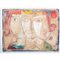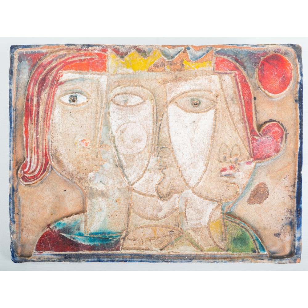 Placca rettangolare in ceramica smaltata ed invetriata decorata con figure di regnanti in policromia. Difetti.