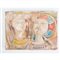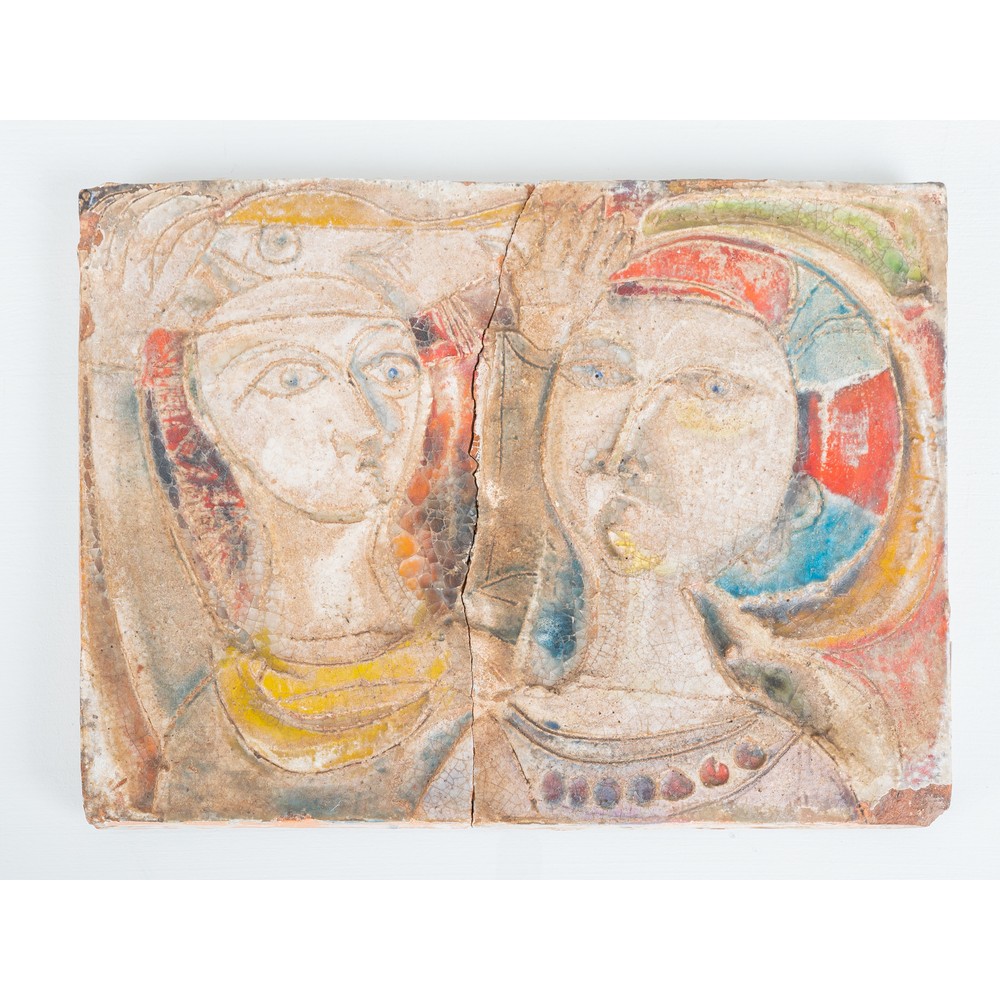 Placca rettangolare in ceramica smaltata ed invetriata decorata con figure umane in policromia. Difetti e rottura.