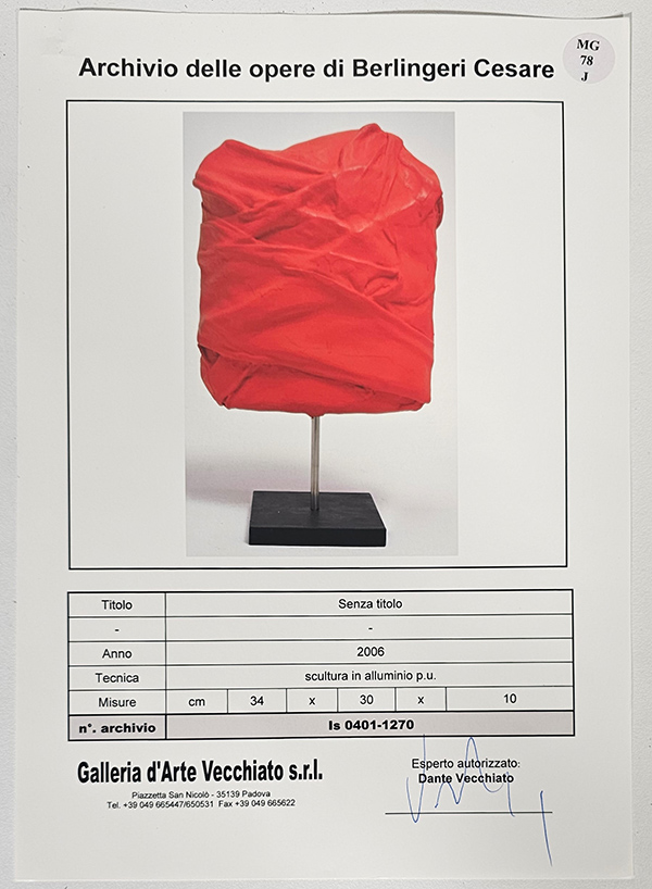 BERLINGERI CESARE, "Senza titolo" scultura in alluminio anno 2006, certificato di archiviazione presso l' archivio delle opere di Berlingeri Cesare a cura della galleria Vecchiato arte su fotografia, cm34x30x10