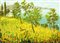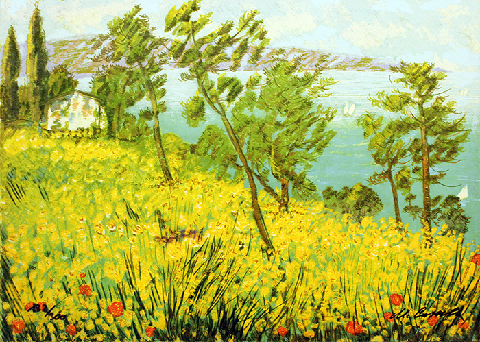 MICHELE CASCELLA, casa in collina, anno 1983, serigrafia e litografia a 30 passaggi di colore, tiratura a 300 esemplari in numeri arabi +C numeri romani e alcune prove d'autore, esemplare 183/300. (La prima immagine è solo a scopo illustrativo). Il colore della tiratura al retro traspare leggermente sul fron