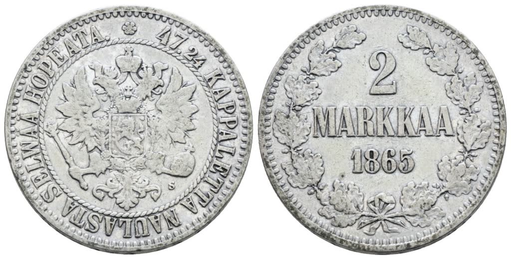 FINLANDIA. Alessandro II (1855-1881). 2 markkaa 1865. Ag; 10,37gr; KM 7.1; BB+