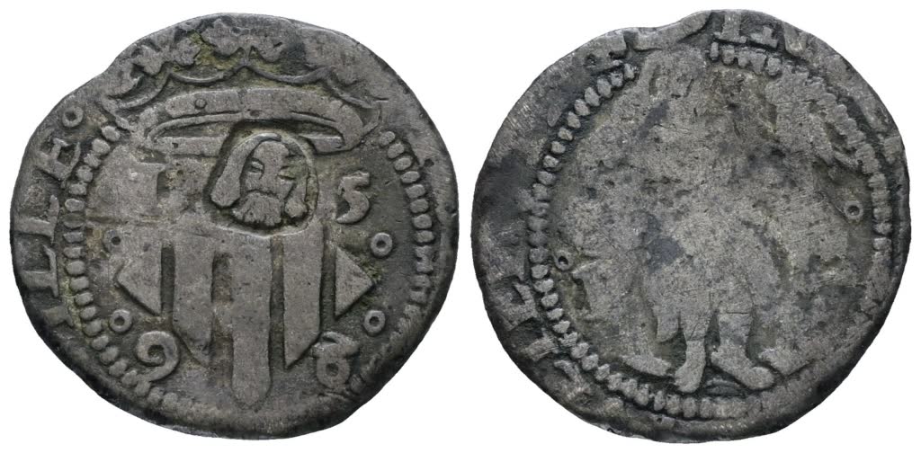 FRANCIA. PERPIGNAN. Filippo II di Spagna (1556-1598). 2 sol 1598. Contromarca con testa di san Giovanni. Mi; 2,9gr; PA 3611; Raro; MB