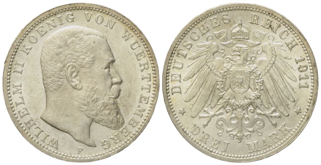 GERMANIA. WURTTEMBERG. Guglielmo II (1891-1918). 3 marchi 1911. KM 635; Ag; 16,67gr. qFDC