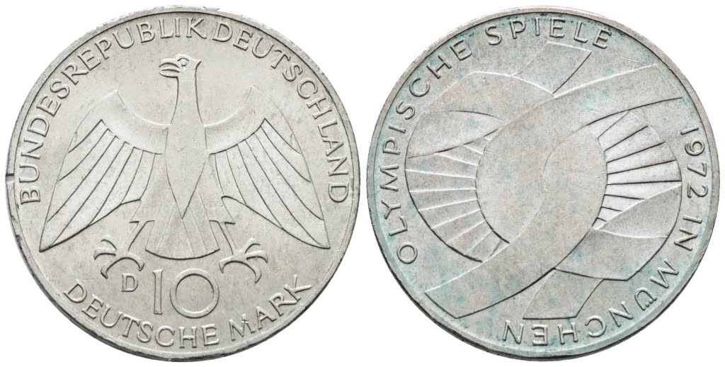 GERMANIA. 10 marchi 1972 D "Giochi olimpici Monaco". KM 131; Ag; 15,5gr qFDC