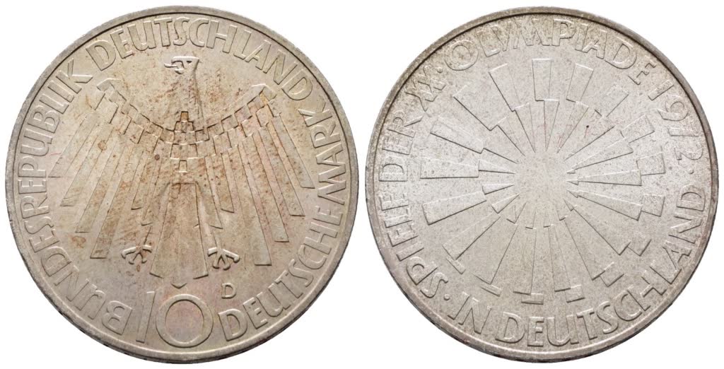 GERMANIA. 10 marchi 1972 "olimpiade di Monaco" D. KM 130; Ag; 15,5gr FDC