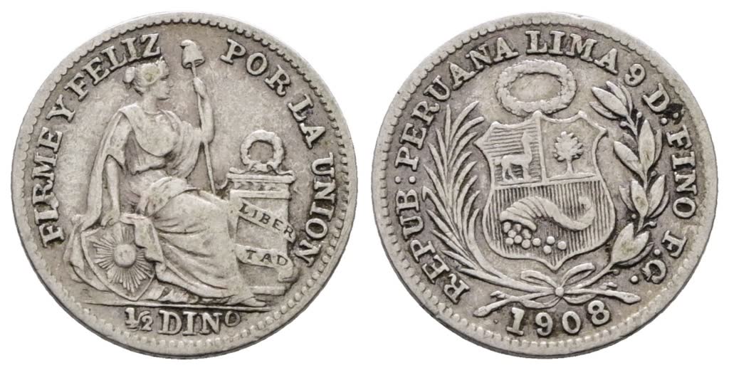 PERU'. 1/2 dino 1/20 sol 1908. KM 206; Ag; 1,25gr BB