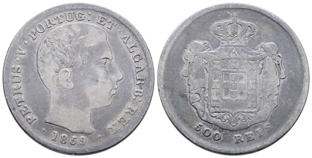 PORTOGALLO. Pedro V (1853-1861). 500 reis 1859. KM 498; Ag; 12,5gr qBB