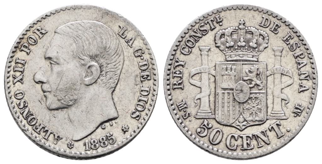 SPAGNA. Alfonso XII (1874-1885). 50 centesimi 1885. KM 685; Ag; 2,5gr BB/SPL