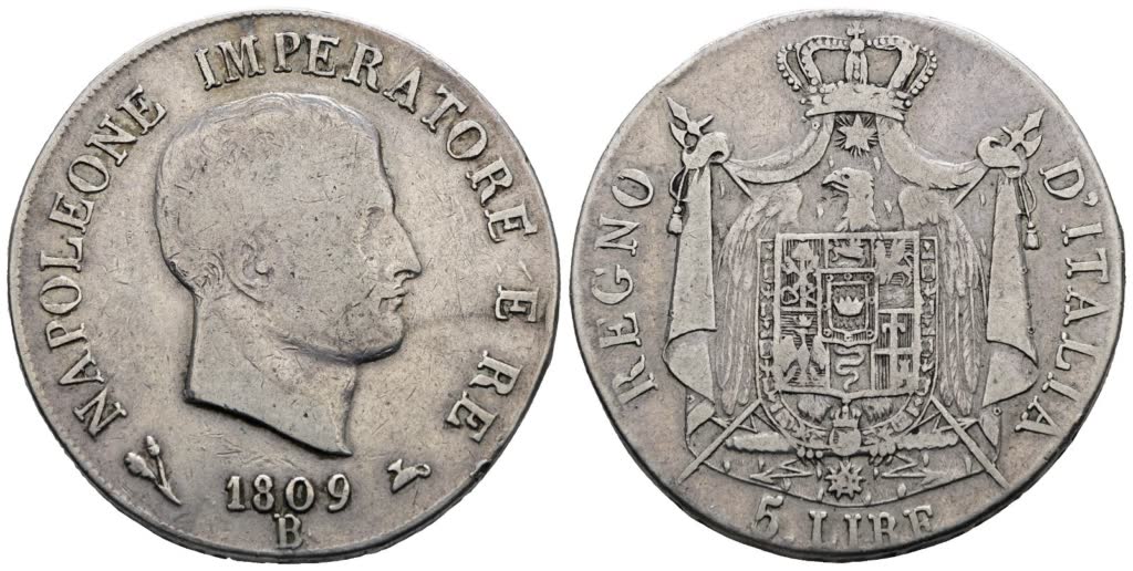 Lot 278 | BOLOGNA. Regno d'Italia. Napoleone I (1805-1814). 5 lire 1809. Ag; 25gr; Gig.99; Raro; MB/BB