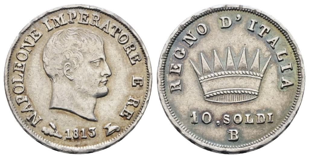 Lot 283 | BOLOGNA. Regno d'Italia. Napoleone I (1805-1814). 10 soldi 1813. Ag; 2,5gr; Gig.183a; RRR; BB/SPL