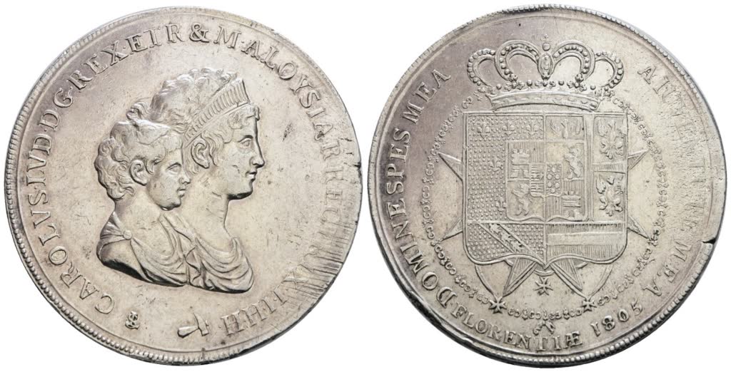 Lot 296 | FIRENZE. GRANDUCATO DI TOSCANA. Carlo Ludovico di Borbone (1803-1807). Dena da 10 lire 1805. Ag; 39,45gr; Gig.9; NC; BB/SPL