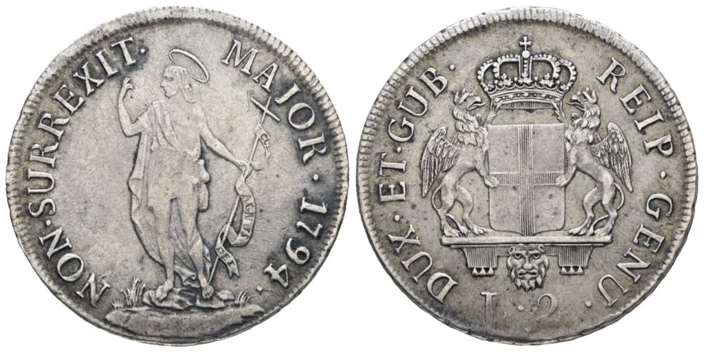 Lot 306 | GENOVA. Dogi Biennali (terza fase, 1637-1797). 2 lire 1794 . Ag; 8,3gr; Mir 317/2; Raro; BB/SPL