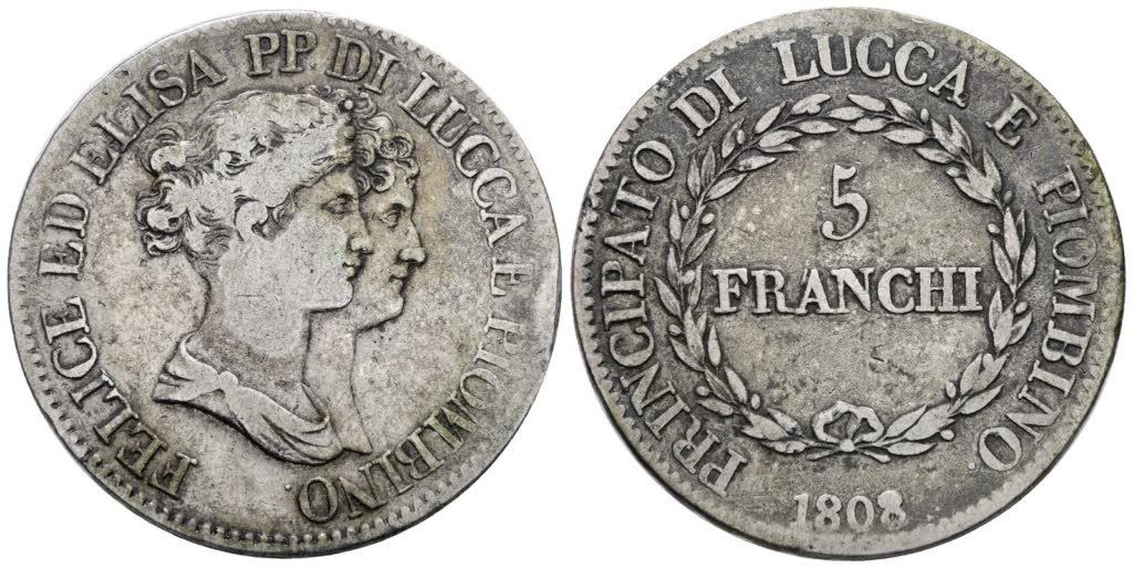 LUCCA E PIOMBINO. Elisa Bonaparte e Felice Baciocchi (1805-1814). 5 Franchi 1808 (3° tipo). Busti medi. Ag; 25gr; Gig.5; Raro; BB