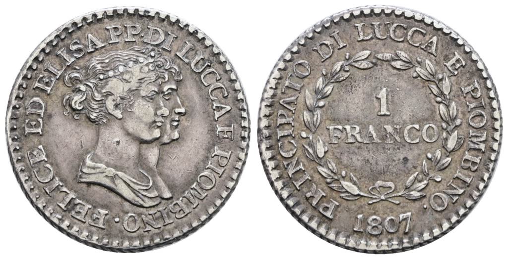 Lot 321 | LUCCA E PIOMBINO. Elisa Bonaparte e Felice Baciocchi (1805-1814). Franco 1807. Ag; 5gr; Gig.9; NC: Q.SPL