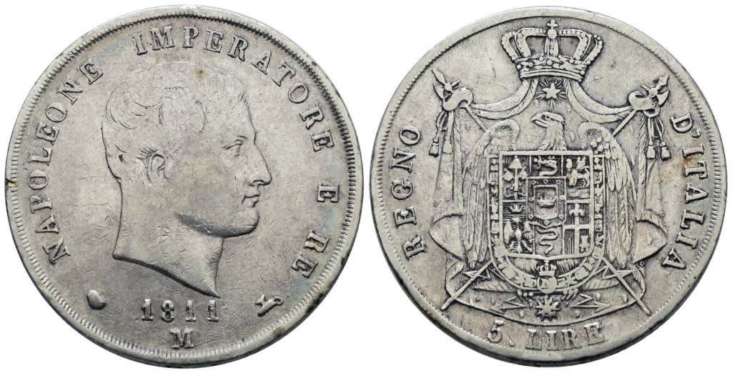 MILANO. Regno d'Italia. Napoleone I (1805-1814). 5 lire 1811. Ag; 25gr; Gig.109; MB/BB