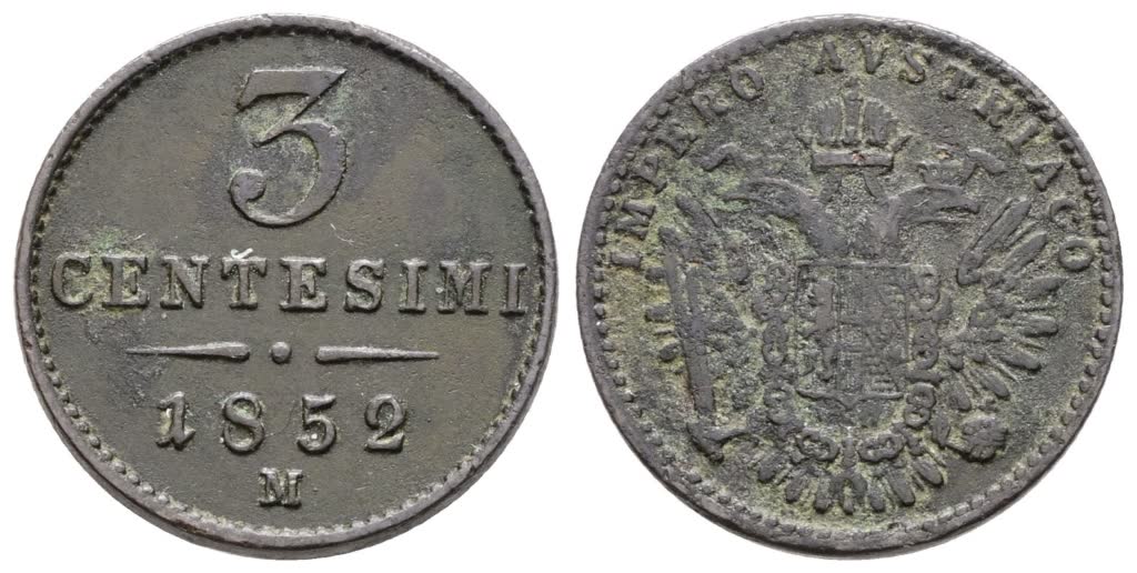 MILANO. REGNO LOMBARDO VENETO. Francesco Giuseppe (1848-1866). 3 centesimi 1852. Cu; 3,28gr; Gig.35; Raro; Q.BB