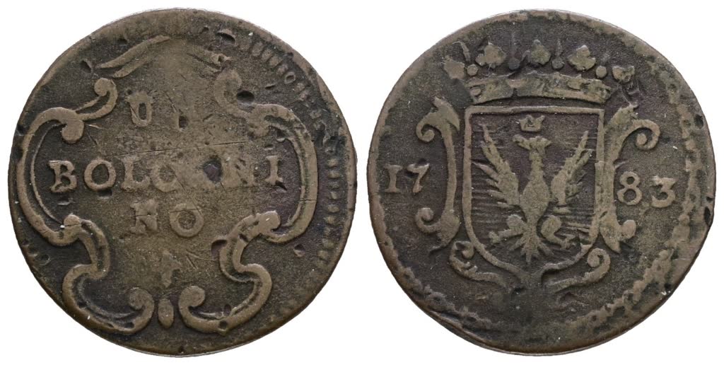 Lot 399 | MODENA. Ercole III d'Este (1780-1796). Bolognino 1783. Cu; 2,79gr; Mir 862/1; MB