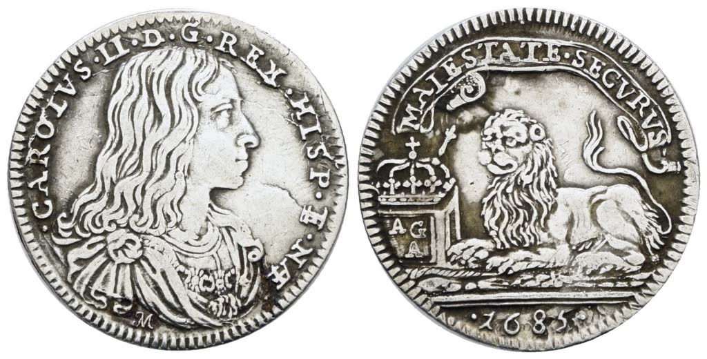 NAPOLI. REGNO DI NAPOLI. Carlo II di Spagna (1665-1700). Carlino 10 grana 1685. Ag; 2,8gr; P.R.30; MIR 301/3; BB+