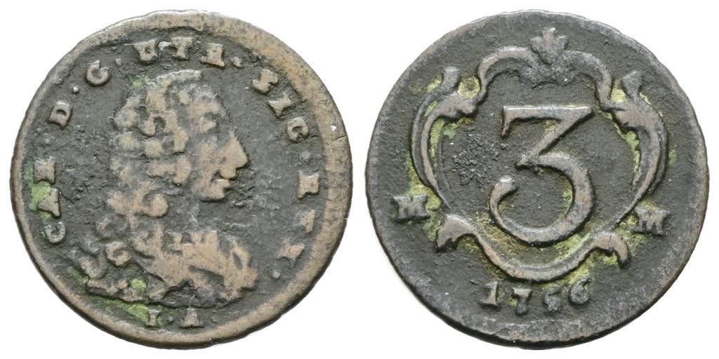 NAPOLI. REGNO DI NAPOLI. Carlo di Borbone (1734-1759). 3 cavalli 1756. Cu; 1,35gr; Gig.65; Raro; ; Q.BB