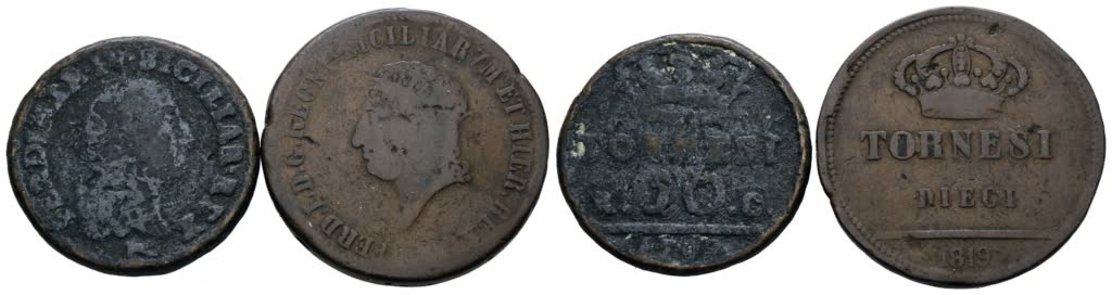 NAPOLI. REGNO DI NAPOLI. Ferdinando IV, I di Borbone. Lotto di 2 monete da 10 tornesi 1798, 1819. Cu; Conservazioni varie
