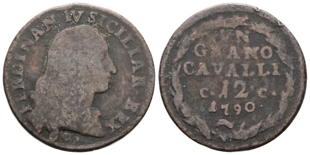 NAPOLI. REGNO DI NAPOLI. Ferdinando IV di Borbone (1759-1799 I per.). Grano 12 cavalli 1790 CC. Cu; 6gr; Gig.139b; Raro; MB