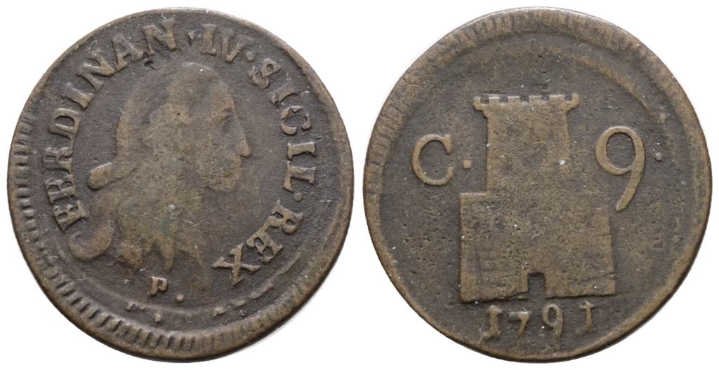 NAPOLI. REGNO DI NAPOLI. Ferdinando IV di Borbone (1759-1799 I per.). 9 cavalli 1791. Cu; 4,7gr; Gig.150; BB, interessante e lieve decentratura