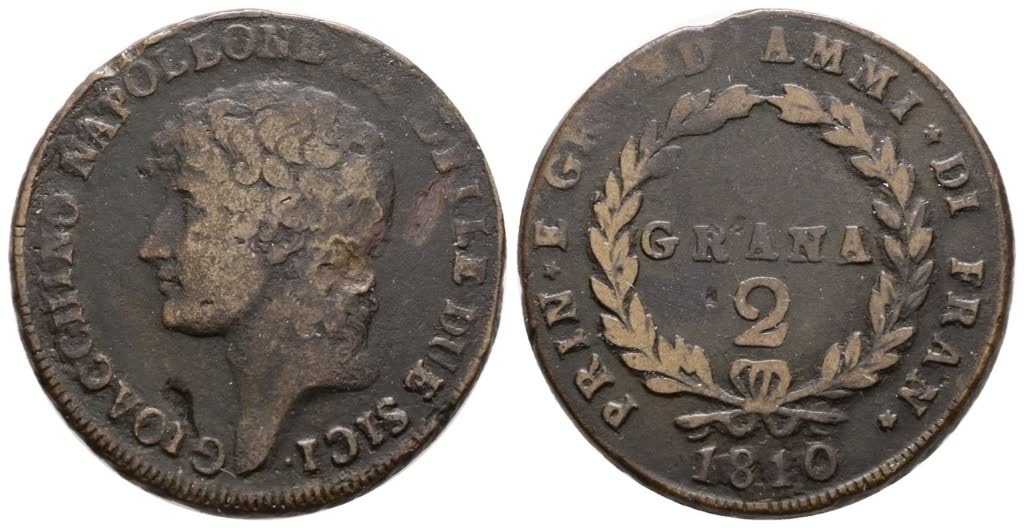 NAPOLI. REGNO DELLE DUE SICILIE. Gioacchino Napoleone (1808-1815). 2 Grana 1810. Cu; 12gr; Gig.6; NC; ;MB/BB