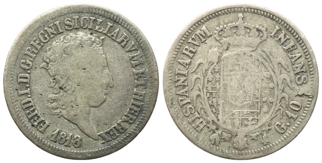 NAPOLI. REGNO DELLE DUE SICILIE. Ferdinando I di Borbone (1816-1825). Carlino da 10 grana 1818. Ag (2,24 g; 18 mm). Gig. 14. NC. MB+