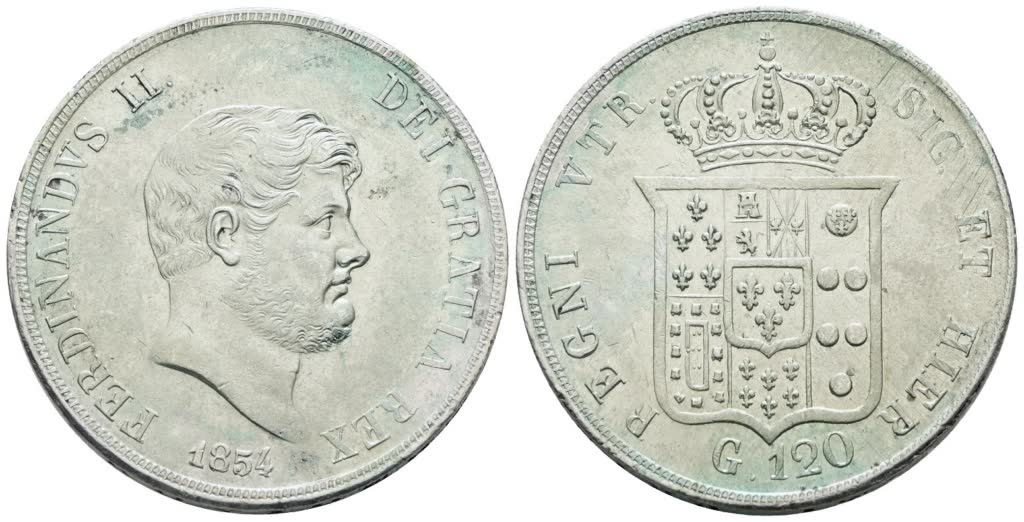 Lot 462 | NAPOLI. REGNO DELLE DUE SICILIE. Ferdinando II di Borbone (1830-1859). Piastra 120 grana 1854. Ag; 27,5gr; Gig.85; SPL