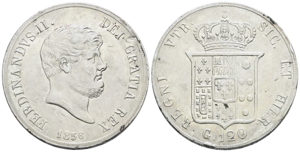 NAPOLI. REGNO DELLE DUE SICILIE. Ferdinando II di Borbone (1830-1859). Piastra 120 grana 1856. Ag; 27,5gr; Gig.87; BB/SPL