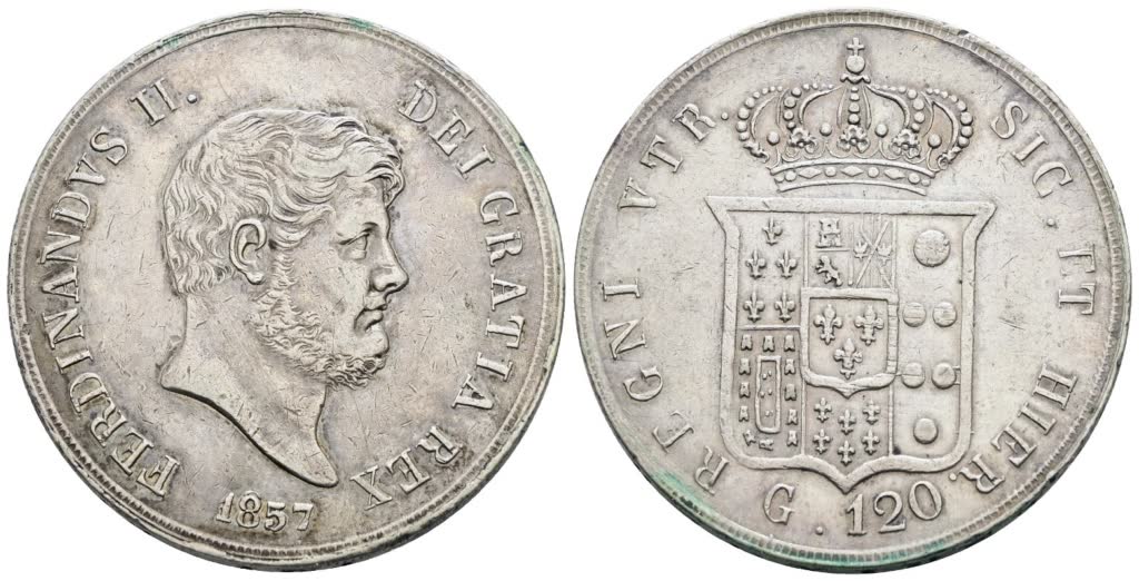 NAPOLI. REGNO DELLE DUE SICILIE. Ferdinando II di Borbone (1830-1859). Piastra 120 grana 1857. Ag; 27,5gr; Gig.88; BB/SPL