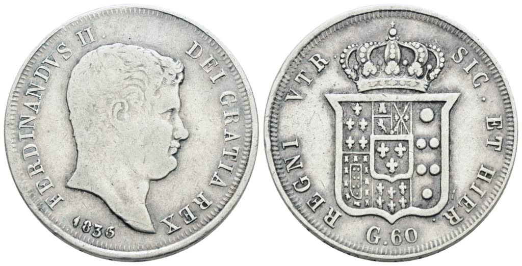 NAPOLI. REGNO DELLE DUE SICILIE. Ferdinando II di Borbone (1830-1859). 60 grana 1836. Ag; 13,7gr; Gig.96a; BB