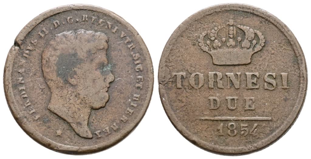 Lot 482 | NAPOLI. REGNO DELLE DUE SICILIE. Ferdinando II di Borbone (1830-1859). 2 tornesi 1854. Cu; 6,2gr; Gig.258; Raro; MB