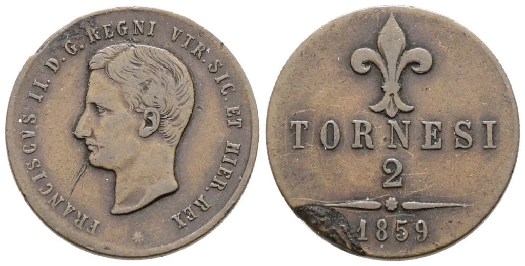 NAPOLI. REGNO DELLE DUE SICILIE. Francesco II di Borbone (1859-1860). 2 tornesi 1859. Cu; 6gr; Gig.6; MB+, mancanza d metallo