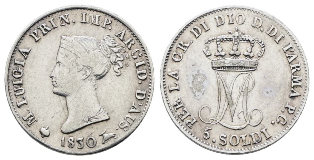 Lot 517 | PARMA. Maria Luigia d'Austria (1815-1847). 5 soldi 1830. Ag; 1,25gr; Gig. 13; Raro; BB
