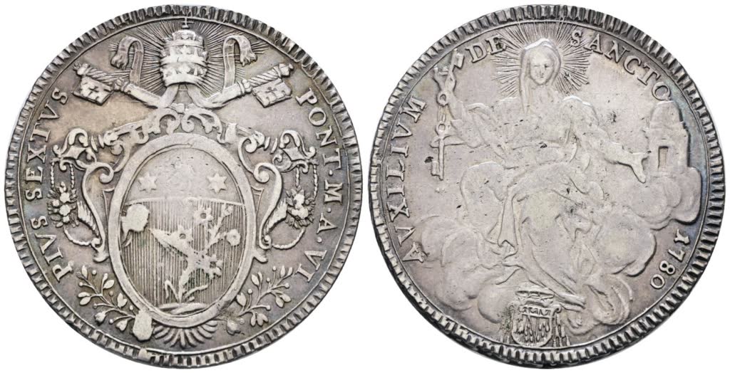 Lot 600 | STATO PONTIFICIO. ROMA. Pio VI (1775-1799). Scudo 1780 "tiara radiata". Ag; 26gr; Munt.17; MIR 2764/4; BB