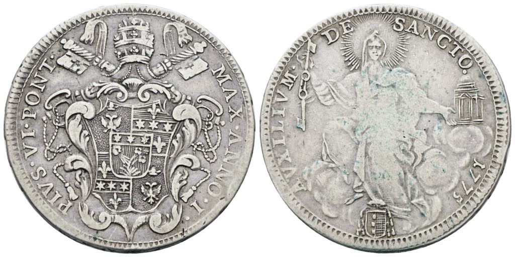 STATO PONTIFICIO. ROMA. Pio VI (1775-1799). Mezzo scudo 1775, anno I. Ag; 13gr; Munt.20; MIR 2765/1; BB