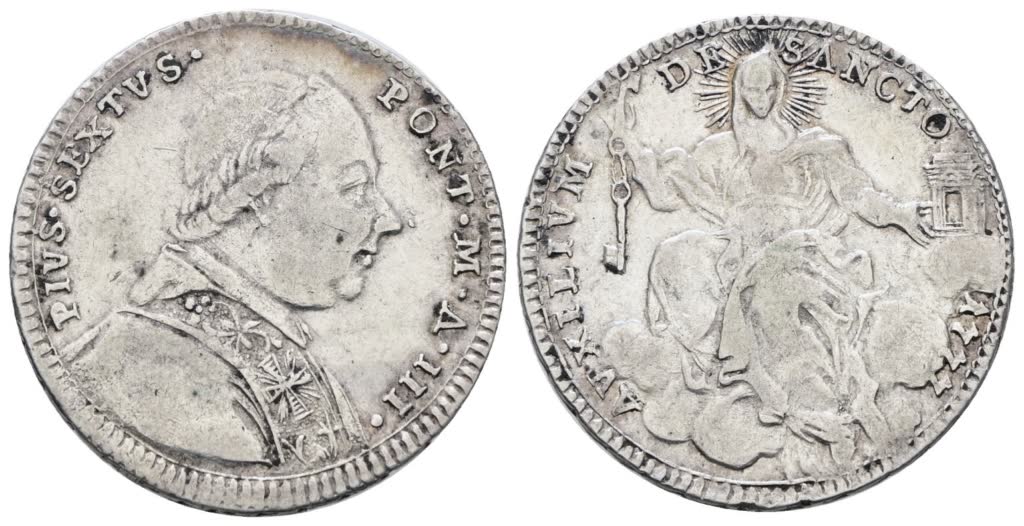 Lot 609 | STATO PONTIFICIO. ROMA. Pio VI (1775-1799). Quinto di scudo, doppio giulio 1777, anno III. Ag; 5gr; Munt.38; MIR 2770/3; BB+