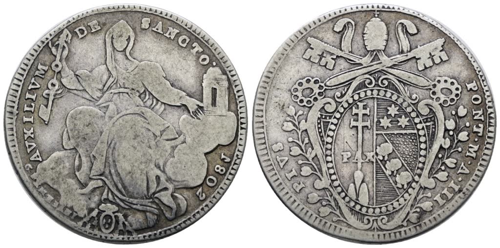 Lot 651 | STATO PONTIFICIO. ROMA. Pio VII (1800-1823). Mezzo scudo 1802 A.III. Ag; 13,25gr; Gig.34; RR; Q.BB