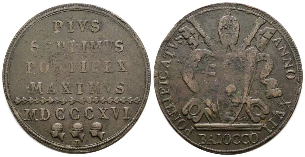 STATO PONTIFICIO. ROMA. Pio VII (1800-1823). Baiocco 1816 A.XVII. Cu; 12gr; Gig.56; RR; Q.BB