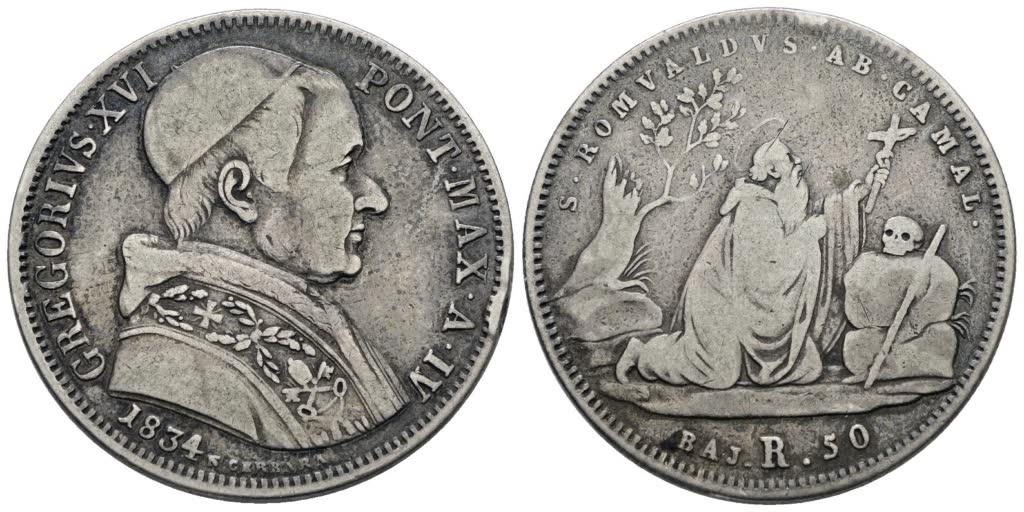 STATO PONTIFICIO. ROMA. Gregorio XVI (1831-1846). 50 baiocchi 1834. Ag; 13,21gr; Gig.84; MB, ex mount
