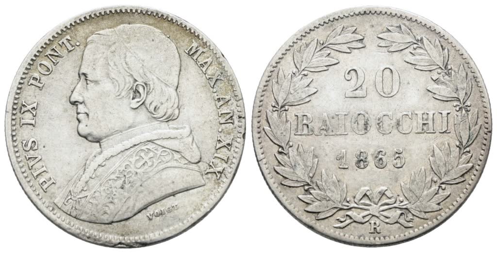 STATO PONTIFICIO. ROMA. Pio IX (1846-1870). 20 baiocchi 1865 anno XIX. Ag; 5,71gr; Gig.107a; BB+
