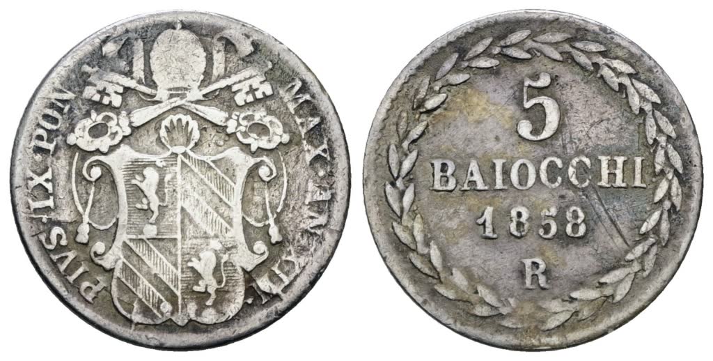 STATO PONTIFICIO. ROMA. Pio IX (1846-1870). 5 baiocchi 1858 anno XIII. Ag; 1,43gr; Gig.154; BB