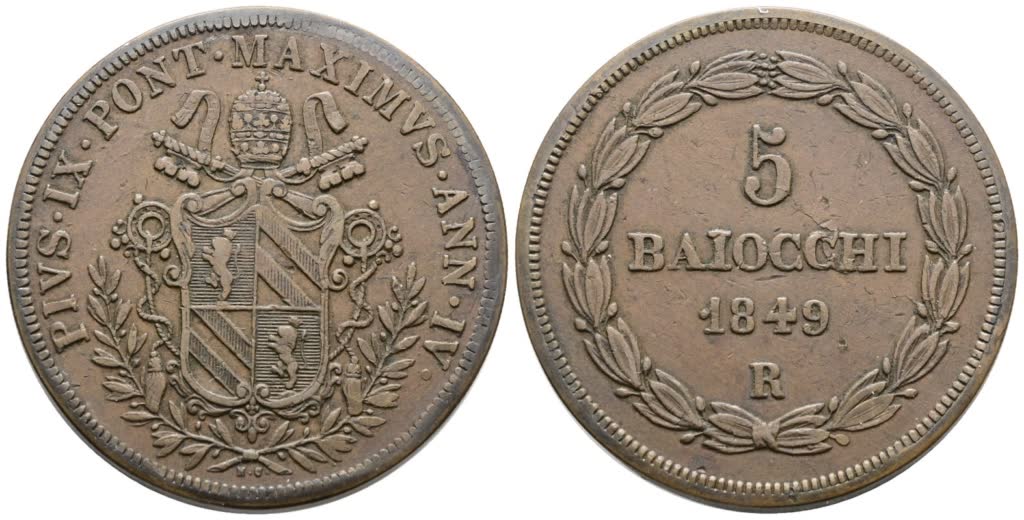 STATO PONTIFICIO. ROMA. Pio IX (1846-1870). 5 baiocchi 1849 anno IV. Cu; 42gr; Gig.166; BB/SPL