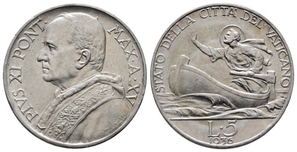 VATICANO. Pio XI (1929-1938). 5 lire 1936. Gig. 27; Ag; 5gr. SPL+