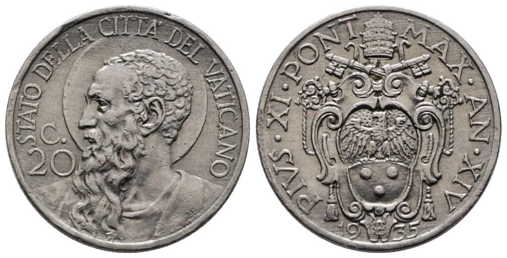 VATICANO. Pio XI (1929-1938). 20 centesimi 1935. Gig. 82; Ni; 4gr. RR. qSPL