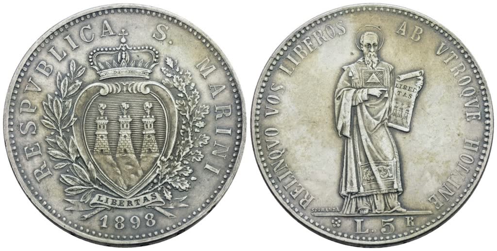 SAN MARINO. Vecchia monetazione (1864-1938). 5 lire 1898. Ag; 25gr; Gig.17; Raro; BB/SPL