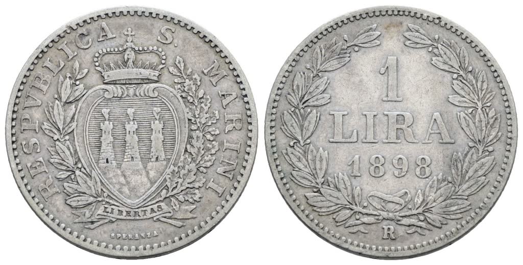 Lot 741 | SAN MARINO. Vecchia monetazione (1864-1938). 1 lira 1898. Ag; 5gr; Gig.27; Raro; BB+