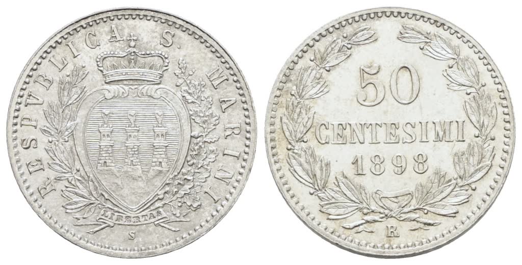 Lot 744 | SAN MARINO. Vecchia monetazione (1864-1938) 50 centesimi 1898. Ag; 2,5gr; Gig.29; Q.FDC