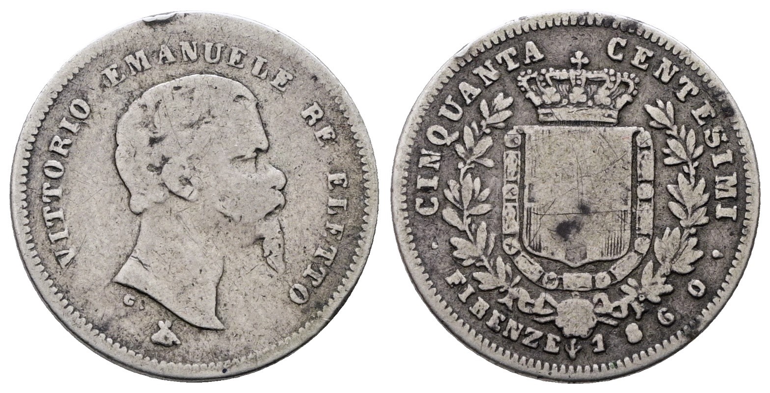 RE ELETTO. FIRENZE. Vittorio Emanuele II (1859-1860). 50 centesimi 1860. Gig.15; Ag; 2,5gr. MB